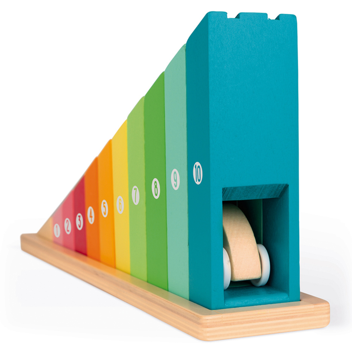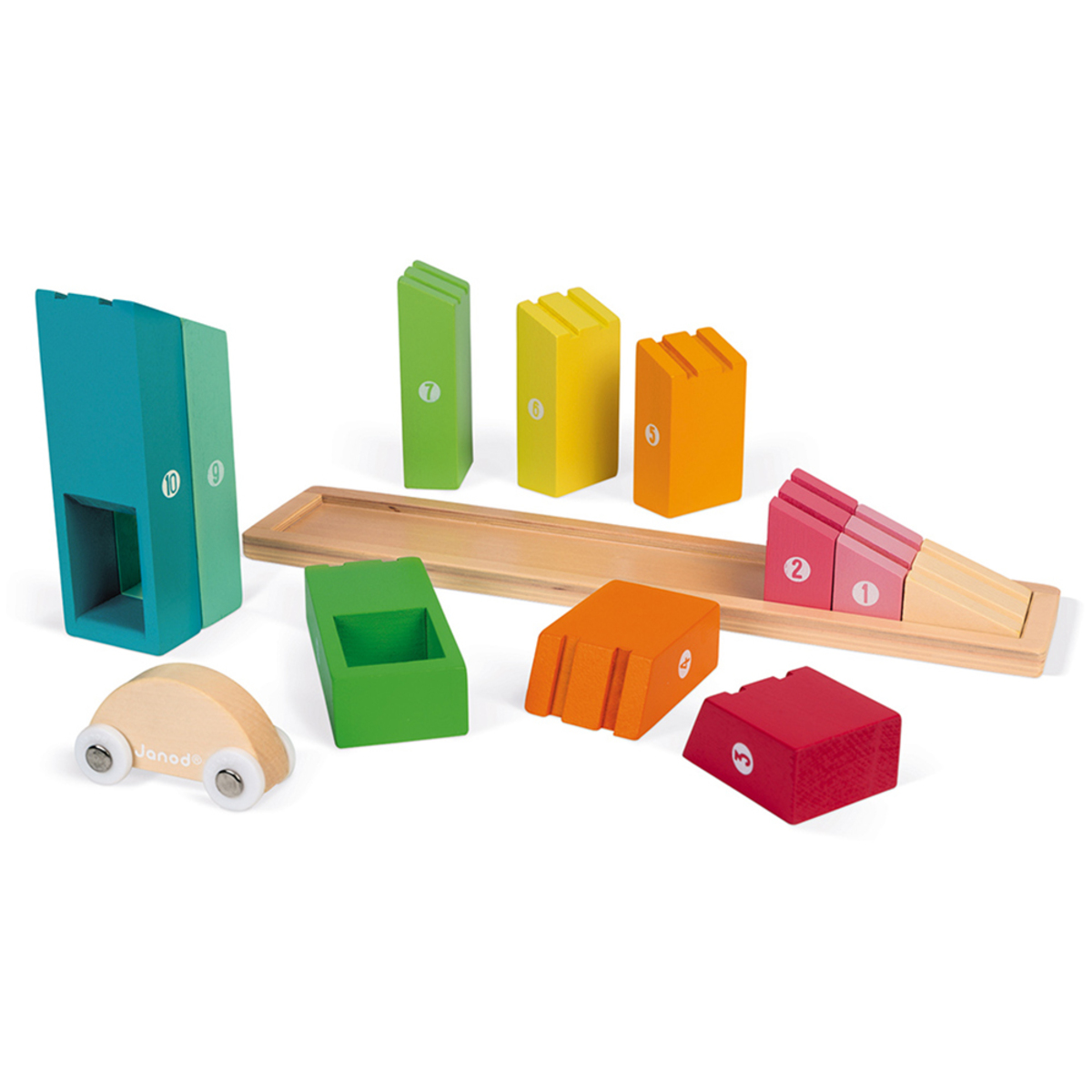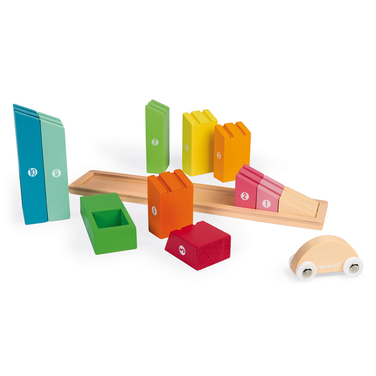 Ce jeu se compose de 10 morceaux de bois numérotés de 1 à 10. Chaque morceau est de taille et de couleur différente. Le but sera de les remettre dans l'ordre. En les organisant de façon crescendo, c'est à dire du plus petit au plus grand, un chemin pour la petite voiture se créera. Elle pourra alors entamer une descente à toute allure.