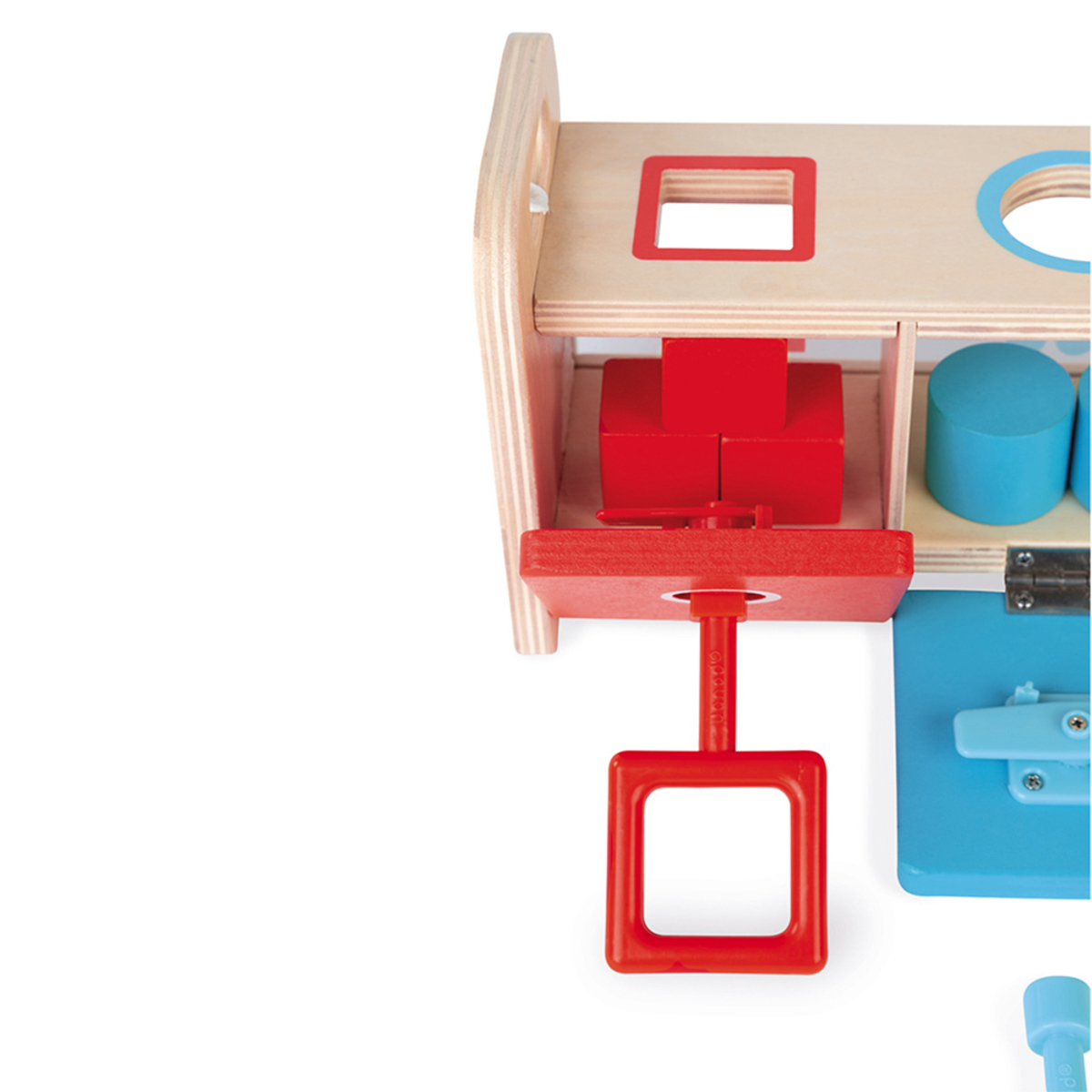 La Boîte à Clefs de Janod exercera votre enfant à reconnaître les formes et les couleurs. Il devra mettre chacune des six formes dans la bonne boîte. Une fois la mission accomplie, il pourra ouvrir les portes une à une grâce aux clefs. Mais attention, il faudra trouver la clef qui ouvrira la porte correspondante avant de pouvoir récupérer les formes.