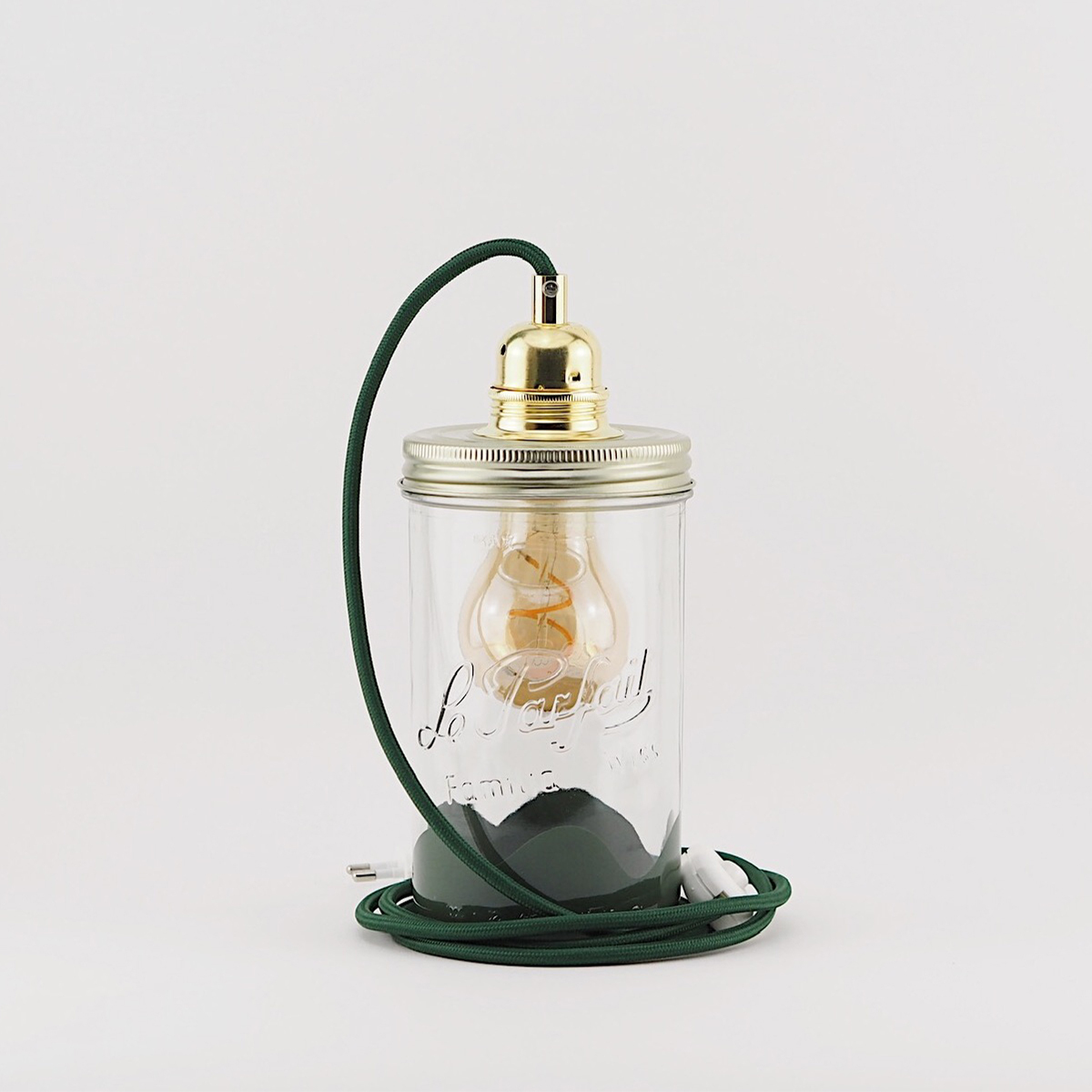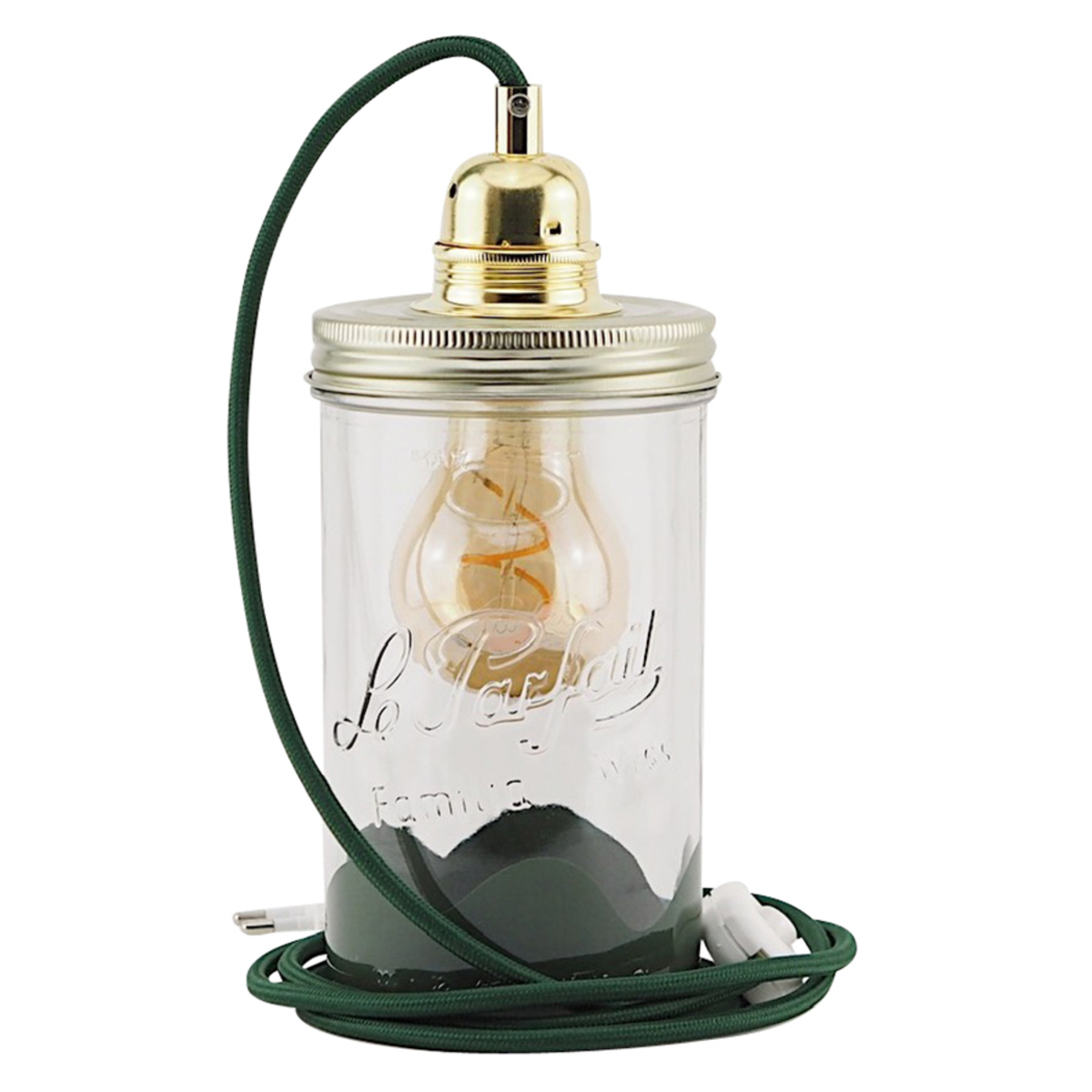 Elancée, cette lampe mesure 20 cm de haut et se compose d'un bocal en verre coloré, d'une douille et d'un câble électrique en fil textile de couleur avec interrupteur.