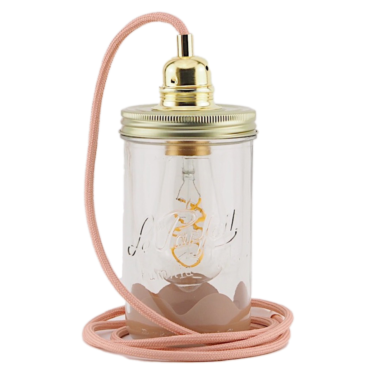 Elancée, cette lampe mesure 20 cm de haut et se compose d'un bocal en verre coloré, d'une douille et d'un câble électrique en fil textile de couleur avec interrupteur.
