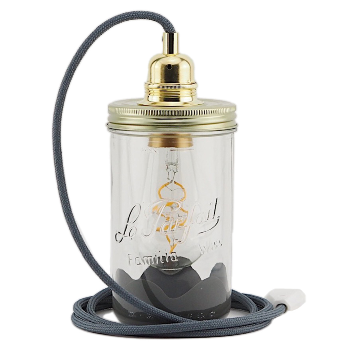 Elancée, cette lampe mesure 20 cm de haut et se compose d'un bocal en verre coloré, d'une douille et d'un câble électrique en fil textile de couleur avec interrupteur.