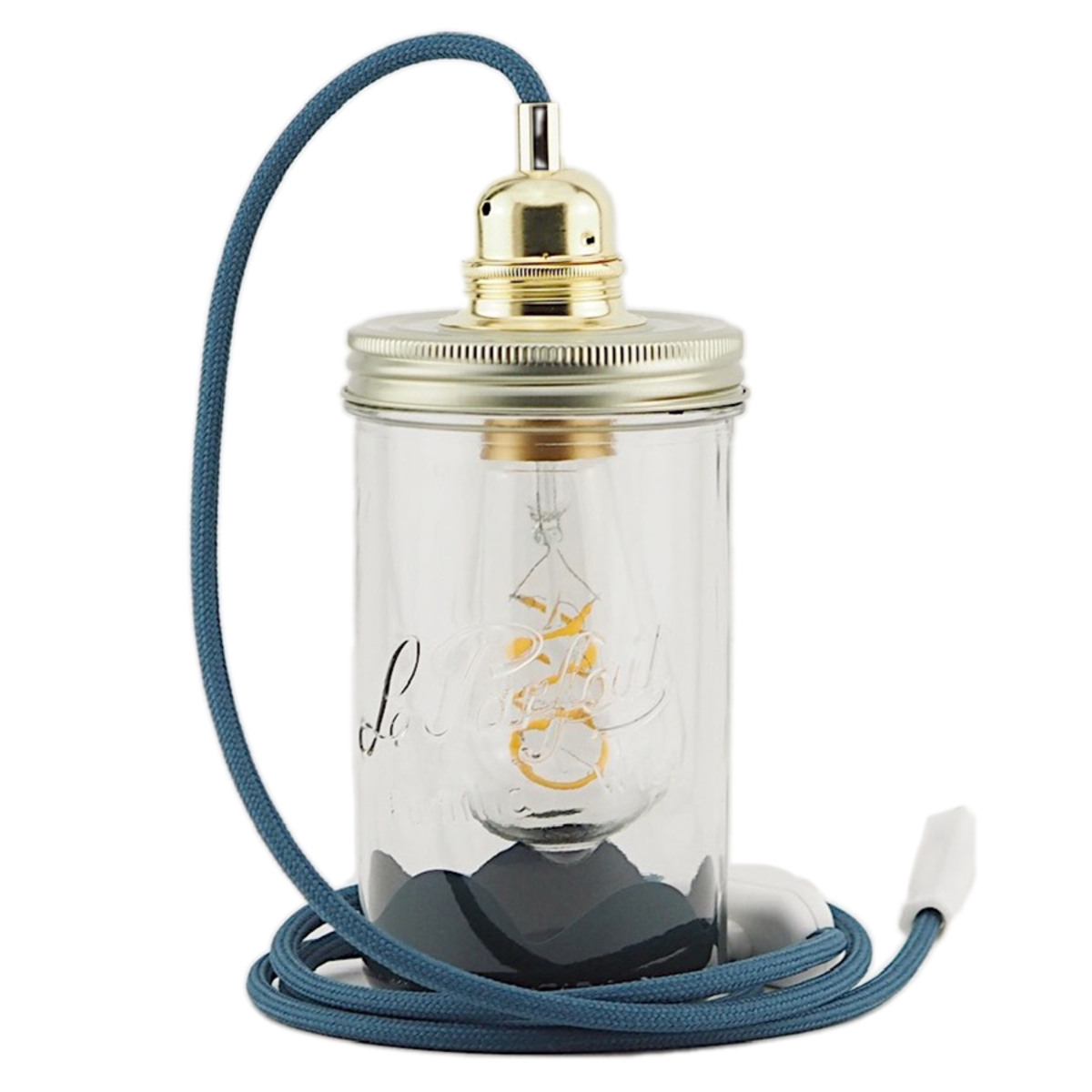 Elancée, cette lampe mesure 20 cm de haut et se compose d'un bocal en verre coloré, d'une douille et d'un câble électrique en fil textile de couleur avec interrupteur.