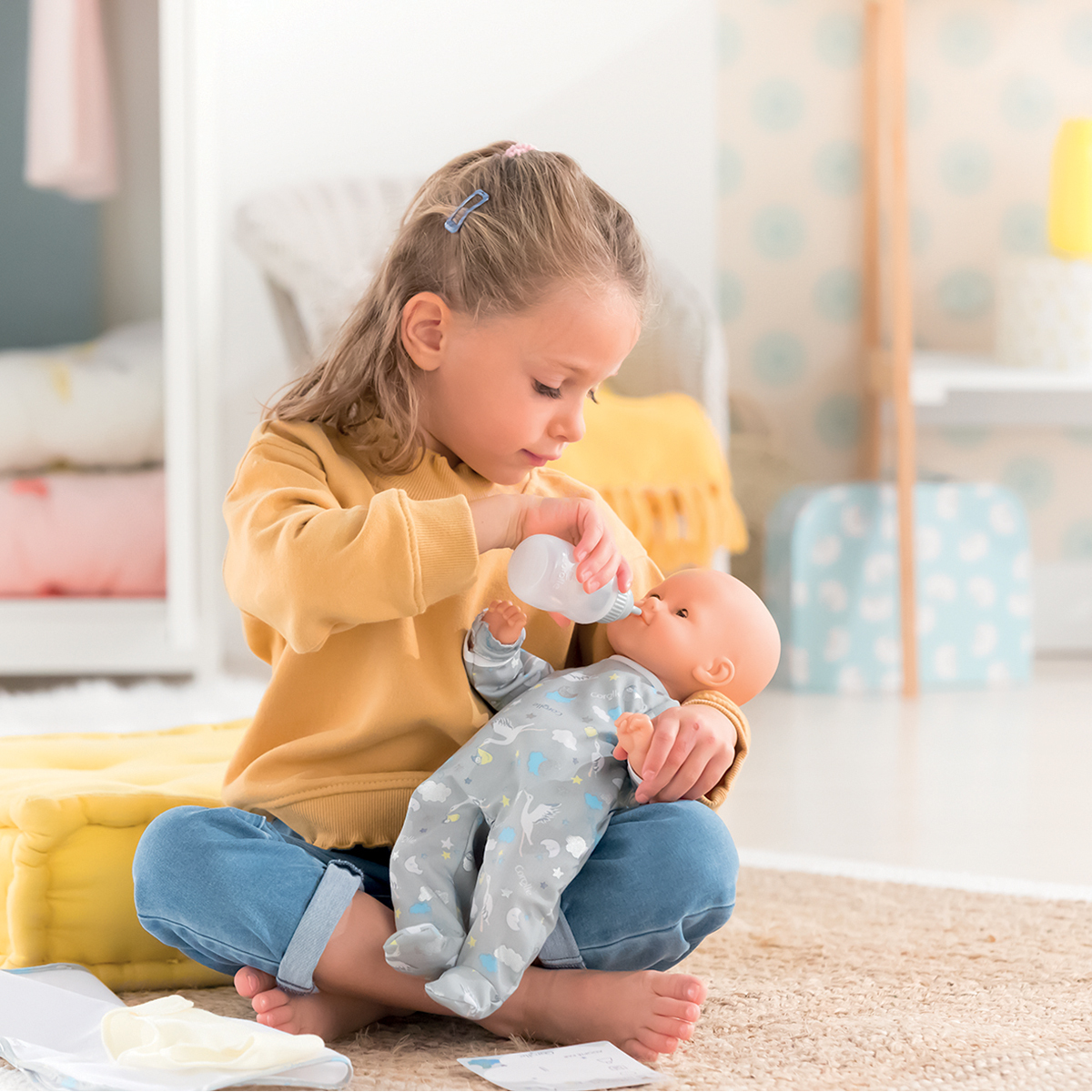 Le Coffret Nouveau-né de Corolle se compose d'un grand poupon et de quatre accessoires (couverture, couche, bracelet de naissance et biberon). Il permettra à votre enfant de faire comme les grands et de prendre soin de son bébé.